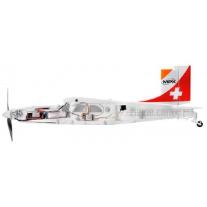 Nous avons équipé ce Pilatus-PC-6 de gouvernes largement dimensionnées, de suffisamment de puissance pour obtenir de saines qualités de vol et rendre possible des montées à la verticale! Grâce à ses grands volets datterrissage, le modèle, tout comme loriginal, est capable de se poser et de décoller sur de très courtes distances. On peut également lui fixer une paire de flotteurs utilisables sur leau ou sur la neige.
